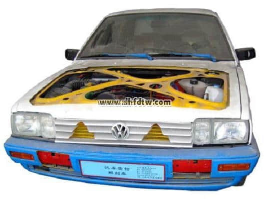 桑塔納整車解剖模型選用桑塔納3000為基礎(chǔ),可容易地看見發(fā)動機(jī)艙、車身側(cè)圍的構(gòu)造結(jié)構(gòu)、鋼板的厚度及獨(dú)立懸掛的結(jié)構(gòu),甚至車輪的輪轂及輪胎的橫截面。此外,車內(nèi)方向盤、排擋桿、手剎、安全帶固定裝置及安全帶卷等平時都被包裹嚴(yán)實(shí)的部件也被特別地一剖為二,內(nèi)部工藝精度、構(gòu)造清晰呈現(xiàn),能夠展示汽車各總成裝置以及各附件位置。
