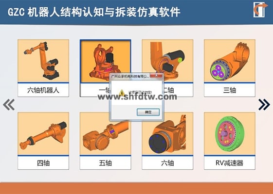 3.2種型號(hào)17套六軸機(jī)器人機(jī)構(gòu)模型:系統(tǒng)內(nèi)置2種型號(hào)17套六軸機(jī)器人機(jī)構(gòu)模型。其中型號(hào)為8KG的工業(yè)機(jī)器人包含六軸機(jī)器人整體1套、一軸機(jī)構(gòu)1套、二軸機(jī)構(gòu)1套、三軸機(jī)構(gòu)1套、四軸機(jī)構(gòu)1套、五軸機(jī)構(gòu)1套、六軸機(jī)構(gòu)1套、RV減速器機(jī)構(gòu)1套、諧波減速器機(jī)構(gòu)1套;型號(hào)為210KG的工業(yè)機(jī)器人包含六軸機(jī)器人整體1套、一軸機(jī)構(gòu)1套、二軸機(jī)構(gòu)1套、三軸機(jī)構(gòu)1套、四軸機(jī)構(gòu)1套、五軸機(jī)構(gòu)1套、六軸機(jī)構(gòu)1套、RV減速器機(jī)構(gòu)1套。提供符合上述功能的軟件截圖。