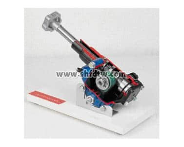 2、手搖輸入軸,模擬發(fā)動(dòng)機(jī)飛輪轉(zhuǎn)動(dòng),踏下離合器踏板,可真實(shí)演示汽車液壓式離合器的工作過(guò)程;
