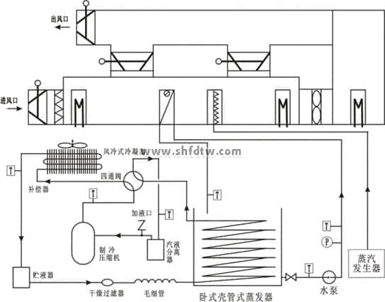 3.空調(diào)冷熱源系統(tǒng)采用1.5P熱泵空調(diào)的室外機(jī)組和盤管蒸發(fā)器,組成冷源和熱源,整個(gè)供水系統(tǒng)的動力源為磁力驅(qū)動泵,由制冷系統(tǒng)將水箱的水溫制冷/制熱,再由水泵打到表冷器中,通過表冷器與空氣進(jìn)行交換,水又回到水箱,實(shí)現(xiàn)了循環(huán)使用。