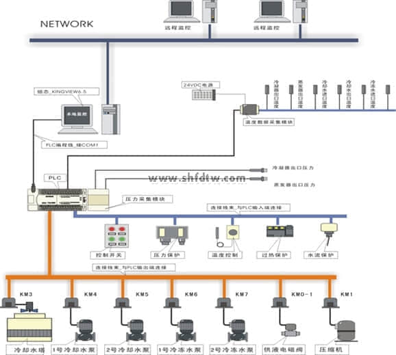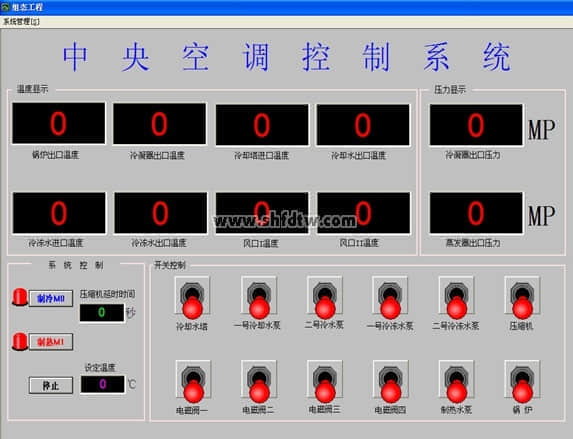 整個(gè)中央空調(diào)采用PLC可編程控制器及工業(yè)總線控制,由計(jì)算機(jī)通過通信總線與PLC進(jìn)行通信,控制整個(gè)中央空調(diào)的運(yùn)行??照{(diào)的運(yùn)行參數(shù)由各類傳感器進(jìn)行采集,并通過通信總線送入計(jì)算機(jī)中,通過專用中央空調(diào)組態(tài)控制軟件進(jìn)行實(shí)時(shí)監(jiān)控。在現(xiàn)場(chǎng)控制柜上可顯示中央空調(diào)的所有運(yùn)行數(shù)據(jù),可進(jìn)行全手動(dòng)和自動(dòng)運(yùn)行操作。