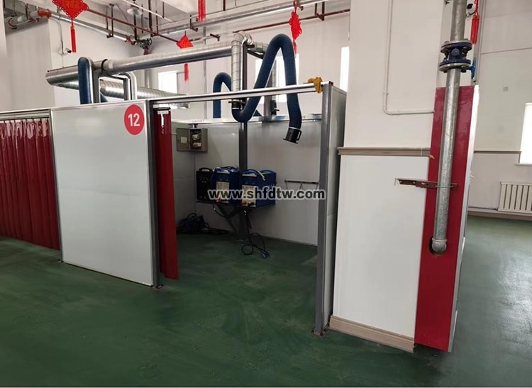 2、工位隔斷絕緣防火,主體材料達(dá)到國(guó)家防火等級(jí)A1級(jí)別,隔斷框架方管固定。工位門須裝有滑道開合紅色遮弧簾,以防學(xué)員實(shí)訓(xùn)或考核比賽時(shí)弧光傷害巡視老師、裁判或觀摩人員眼睛。
