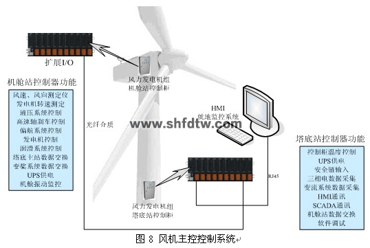 主控系統(tǒng)用于連接風速風向傳感器、震動傳感器、位置傳感器、測量、安全鏈、監(jiān)控系統(tǒng)等,控制風速方向、偏航、變槳等信息。
