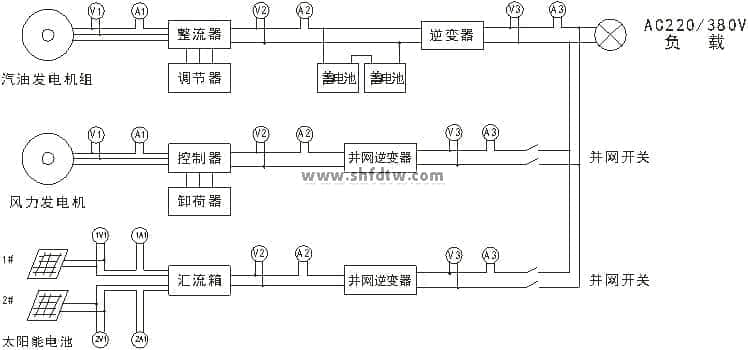 系統(tǒng)由2KW汽/柴油發(fā)電機(jī)組、整流系統(tǒng)、儲(chǔ)能蓄電池、并網(wǎng)逆變器、安全保護(hù)開關(guān),蓄電池組、風(fēng)力發(fā)電控制器、卸荷器,風(fēng)機(jī)并網(wǎng)控制器、并網(wǎng)逆變器,光伏組件,匯流箱、光伏并網(wǎng)逆變器,監(jiān)控儀表、直流屏,交流屏、監(jiān)控單元等組成。