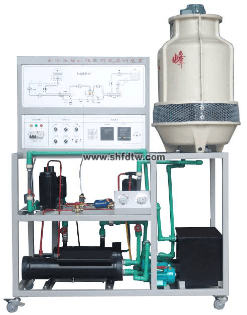 “壓縮機(jī)性能測試實驗裝置”是采用蒸汽壓縮式制冷循環(huán)系統(tǒng),它配備全封閉式制冷壓縮機(jī)、冷凝器、蒸發(fā)器等制冷系統(tǒng)真實部件,并設(shè)有智能溫度調(diào)節(jié)儀、流量計、壓力表、電壓表、電流表等測量儀表。它不但能開設(shè)制冷壓縮機(jī)性能參數(shù)的測定實驗,而且不能進(jìn)行制冷循環(huán)基本原理的演示實驗。本裝置適用于大中專院校制冷專業(yè)相關(guān)課程的教學(xué)實驗。