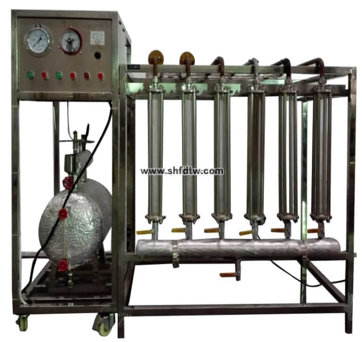由六組不同性能的傳熱管,蒸汽發(fā)生器和風機組成,可觀察和分析在自由對流、強迫對流影響管道傳熱的傳熱系數(shù)K值。 設(shè)備配置:實驗銅管(硅酸鹽保溫管、鋸末保溫管、鍍鉻保溫管、光管保溫管、黑管保溫管、管束保溫管)、配氣管、計量管、低噪音風機、電熱鍋爐、壓力保護裝置(限壓閥、電接點壓力表)、壓力表、電控裝置及箱體、控制閥門??刂婆_、不銹鋼支架、由不同性能的傳熱管道(銅裸管、涂黑管、翅片管、玻璃絲棉保溫管、鋸末保溫管、鍍鉻管),蒸汽發(fā)生器等組成。