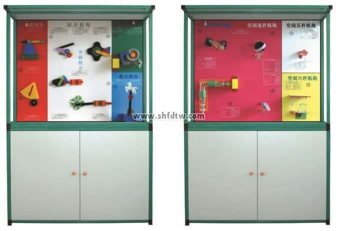 《機(jī)械原理》陳列柜共分十個(gè)柜和一個(gè)電腦控制臺(tái),進(jìn)行多媒體聲控同步解說(shuō)演示。由PC機(jī)電腦控制順序或任選運(yùn)行每個(gè)柜模型動(dòng)作,同時(shí)電腦播放三維動(dòng)畫圖像及語(yǔ)音講解同步模型動(dòng)作。根據(jù)大、中專院校、技校、職業(yè)學(xué)校的機(jī)械原理教學(xué)大綱而設(shè)計(jì)的一套電化多媒體教學(xué)設(shè)備。