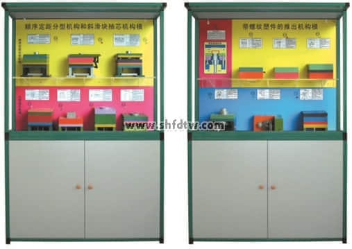 陳列柜共分十二個(gè)柜和一個(gè)電腦控制臺(tái),進(jìn)行多媒體動(dòng)畫演示。由PC電腦軟件控制順序或任選播放三維動(dòng)畫同步模型演示模具功能原理。本套陳列柜80多件塑料模具均采用高強(qiáng)度硬聚氯材料制作而成,各種模具均可進(jìn)行拆分裝配。
