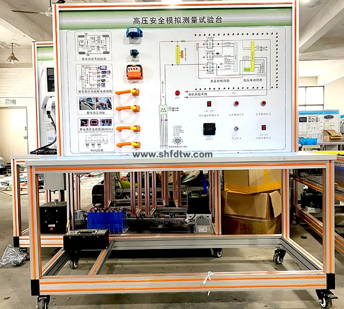 動力電池組、國標充電槍與充電座、漏電傳感器模塊、絕緣傳感器模塊、安全維修塞模塊、漏電模擬操作單元、高壓安全系統(tǒng)操作單元、操作控制臺、訓練控制按鈕、一體化全鋁合金型材搭建的移動臺架(1500×700×1700mm 帶自鎖腳輪裝置,帶安裝檢測端子的原理面板,面板1448×940mm)、設備操作說明書。