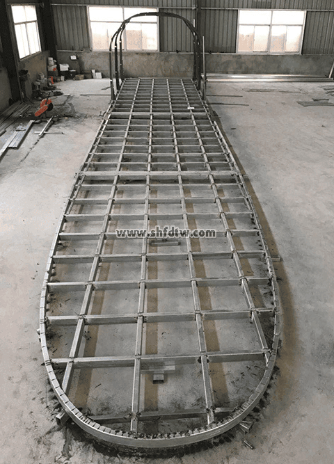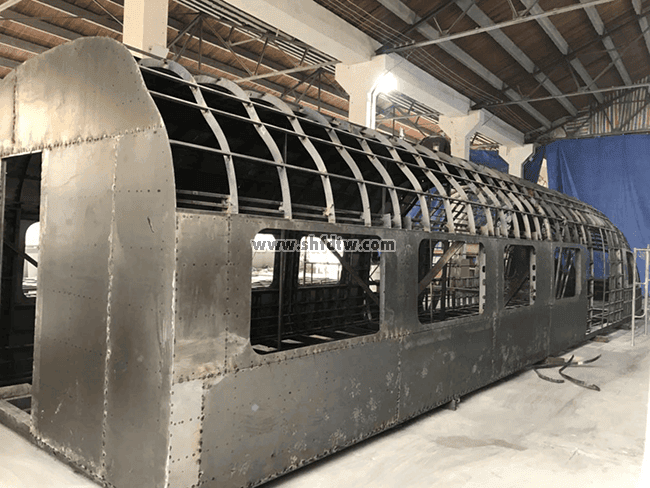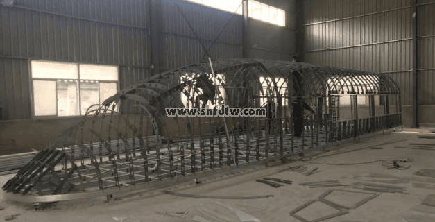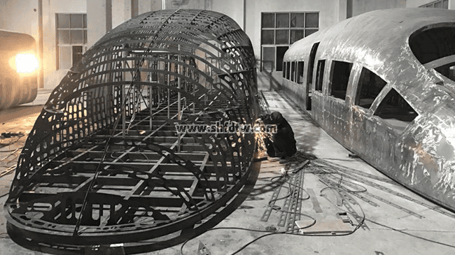 骨架為 5mm 厚鋼板高精度切割弧形焊接,在焊接、銼修處涂鐵紅防銹底漆,蒙1.5mm 厚鋼板,車身兩側(cè)切割窗口鑲嵌高級(jí) PC 耐力透明板。