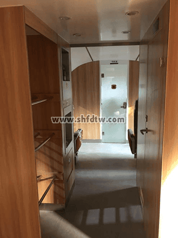 4)一等旅客區(qū)右后方配備大型行李儲(chǔ)藏架和模擬飲水機(jī);滅火器對(duì)面衛(wèi)生間區(qū)域