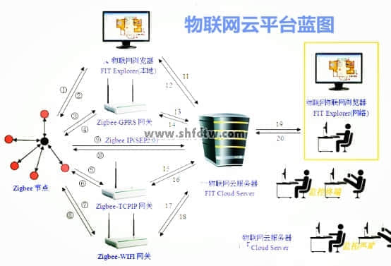 以一個“智能家居”的應(yīng)用為例,解釋下整個平臺的運作機制:首先,zigbee節(jié)點采集室內(nèi)溫濕度、門鎖、煤氣、火焰等信息,通過1/3/5/7/9號通路傳至電腦或者網(wǎng)關(guān),電腦可以對此信息進行本地化處理;如果需要進行網(wǎng)絡(luò)監(jiān)控,則通過11/13/15/17號通路,發(fā)送至“飛比物聯(lián)網(wǎng)云服務(wù)器”(以下簡稱“云服務(wù)器”)進行保存;“監(jiān)控終端”-可以是電腦或者其它可以連網(wǎng)的嵌入式系統(tǒng),通過查詢,獲取服務(wù)器內(nèi)容,并在終端設(shè)備上進行顯示或者控制。