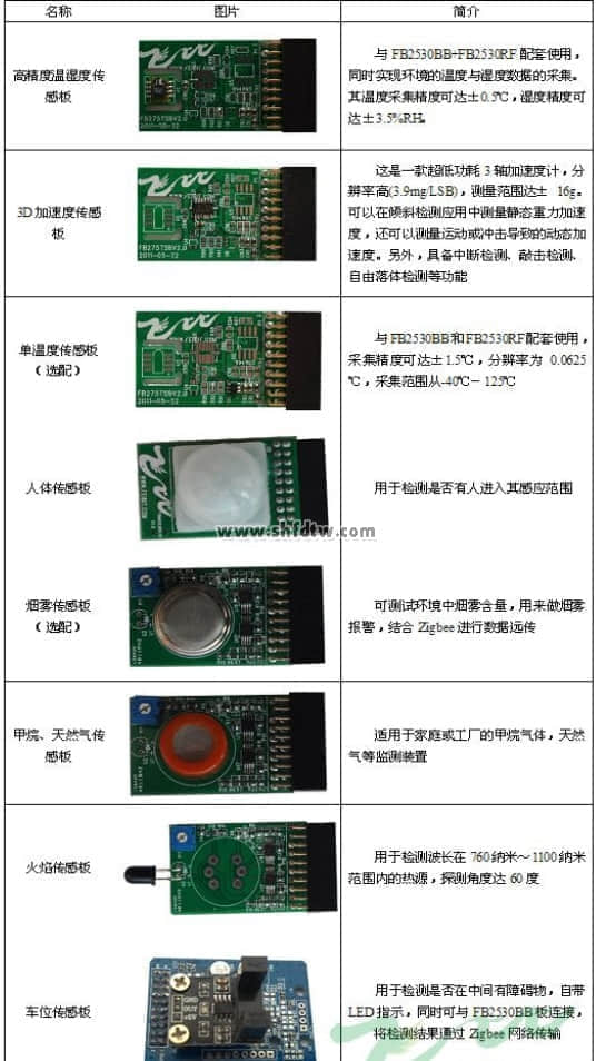 TW-FIT1000標(biāo)配共用8個Zigbee節(jié)點,每個節(jié)點均由一個射頻板與一個底板構(gòu)成,如下表:
