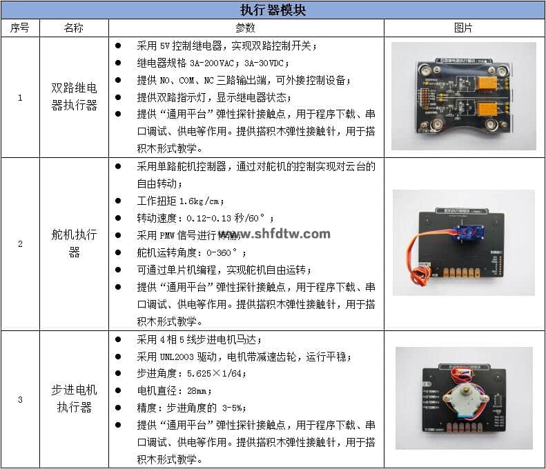 執(zhí)行器模塊可選:雙路繼電器、舵機、步進電機、云臺控制器、風扇節(jié)點、模擬空調(diào)節(jié)點、窗簾執(zhí)行器、LED燈光節(jié)點、水泵節(jié)點、噴霧器節(jié)點等多種執(zhí)行器;
