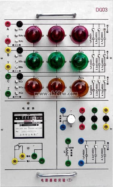 設(shè)有燈組(9個15W彩燈)實驗電路、電容組、單相電度表、日光燈實驗電路。設(shè)有互感實驗電路(大小互感線圈各一個)、鐵芯變壓器(36V/220V、50W)一個。