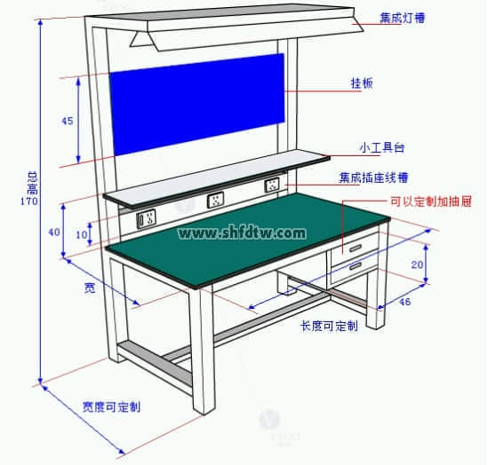 燈架:加高95cm燈架,預(yù)裝燈槽,燈架頂下方為掛板、儀表臺、集成線槽。(燈管需要客戶自配LED雙端T8燈管,掛鉤零件盒不含);