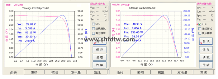 ● 可測量參數(shù): I-V曲線,P-V曲線,短路電流,開路電壓,峰值功率,峰值功率點電壓、電流,定電壓點電流,填充因子,轉(zhuǎn)換效率,串聯(lián)電阻,并聯(lián)電阻,太陽電池溫度,環(huán)境溫度、輻照度。