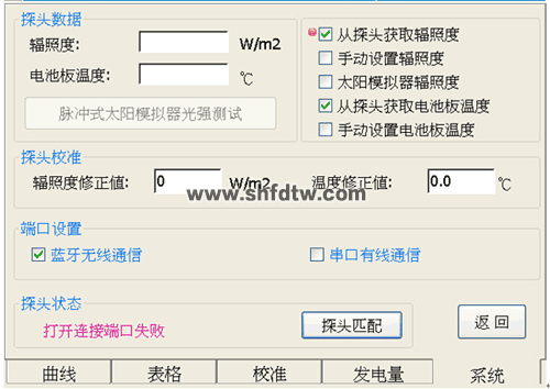 環(huán)境參數(shù)獲取方式靈活多樣,提供了從探頭獲取數(shù)據(jù)或手動設(shè)置功能,并額外提供了脈沖式太陽模擬器光強(qiáng)測試功能。由于日常使用環(huán)境的變化,對探頭的測試數(shù)據(jù)會產(chǎn)生一定影響,為用戶貼心設(shè)計了修正系數(shù)設(shè)置。探頭與主機(jī)的連接方式也分為藍(lán)牙與串口連線兩種選擇方式。