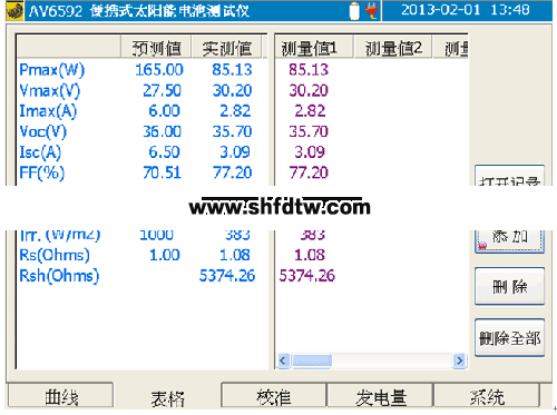 列表顯示當(dāng)前被測光伏陣列多組測試結(jié)果。測試結(jié)果已經(jīng)折算至單個組件,并提供更多用戶關(guān)心的參數(shù),能直接與修正模型中的組件參數(shù)對比,明確反映被測組件的性能優(yōu)劣。