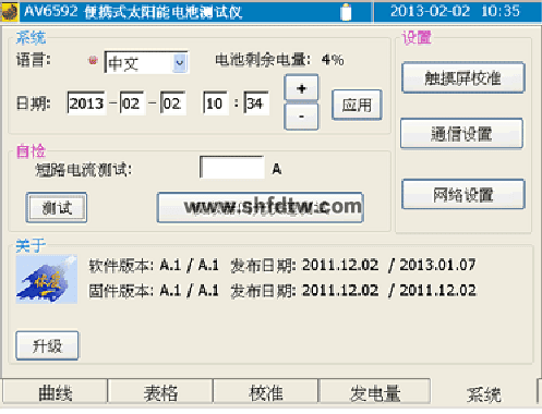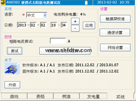 系統(tǒng)界面提供了多國語言選擇,目前提供了中文與英文兩種語言界面。系統(tǒng)界面還提供了日期與時間設(shè)置功能,方便校時。另外提供了附帶的短路電流測試功能,能夠快速測試被測陣列的短路電流。模擬器閃光快速測試是本儀器的一項獨特功能,能夠利用瞬態(tài)模擬器進(jìn)行組件伏安特性測試。本界面還提供了系統(tǒng)軟件升級功能,能夠方便的通過USB盤進(jìn)行系統(tǒng)升級。在本界面中提供對遠(yuǎn)程監(jiān)控的設(shè)置功能。