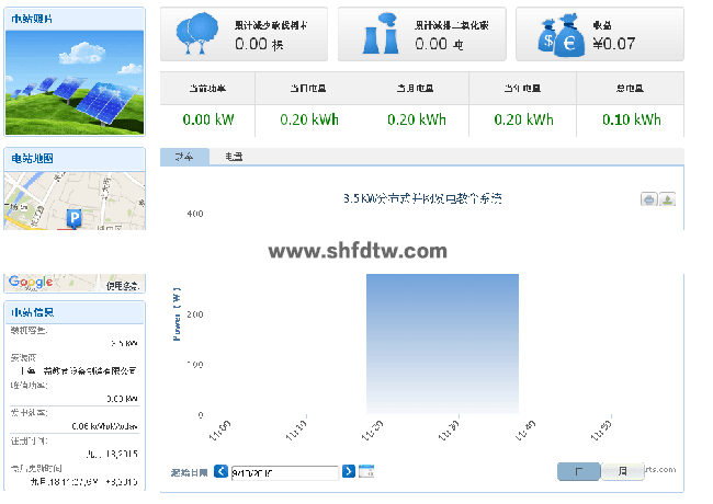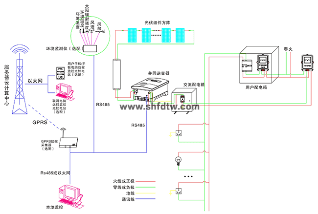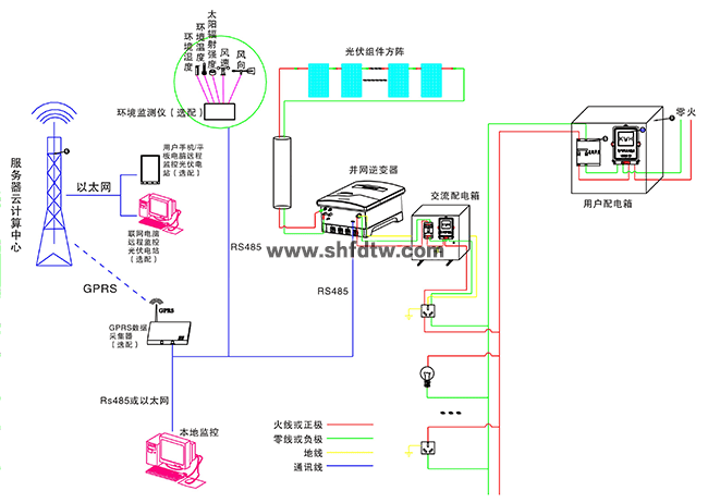 在晴朗的白天,裝在屋頂上的光伏組件發(fā)出的直流電經(jīng)過(guò)并網(wǎng)逆變器逆變成與電網(wǎng)同頻率同相位的單相交流電給負(fù)載進(jìn)行供電,在夜晚或陰雨天等太陽(yáng)光照不足的情況下,系統(tǒng)處于待機(jī)狀態(tài),負(fù)載用電全部來(lái)自電網(wǎng)。另外在系統(tǒng)與互聯(lián)網(wǎng)聯(lián)網(wǎng)情況下,可以通過(guò)系統(tǒng)監(jiān)控軟件來(lái)實(shí)時(shí)查看系統(tǒng)的運(yùn)行狀態(tài)和故障信息,或者是選配遠(yuǎn)程通訊數(shù)據(jù)采集器,將系統(tǒng)工作數(shù)據(jù)通過(guò)GPRS或以太網(wǎng),傳輸?shù)侥氖謾C(jī)、平板電腦或任意一臺(tái)聯(lián)網(wǎng)的電腦,以便于遠(yuǎn)程實(shí)時(shí)掌控電站的信息。