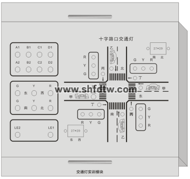 可進行PLC編程控制模擬交通燈運行過程。模塊使用各種顏色的LED指示燈模擬交通燈的運行狀態(tài),交通燈包含十字路口4個方向的黃綠紅燈,包括汽車走向指示等。PLC信號通過接線端子方式連接到模塊上,學(xué)生編輯好PLC程序,下載運行。交通燈實現(xiàn)交替點亮指示。提供設(shè)備架構(gòu)三維圖。