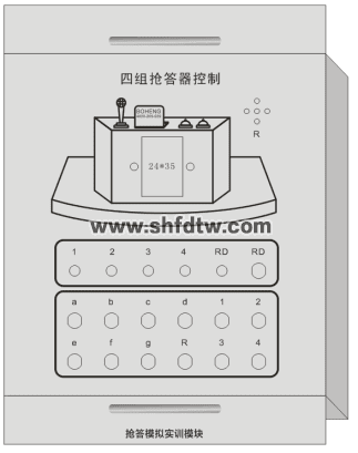 可進行PLC編程控制競賽選手搶答過程。模塊使用各種顏色的LED指示燈模擬競賽選手的搶答狀態(tài)、優(yōu)先排序狀態(tài)、答題對錯狀態(tài)等。按鈕輸入模擬搶答按鈕。PLC信號通過接線端子方式連接到模塊上。提供設(shè)備架構(gòu)三維圖。
