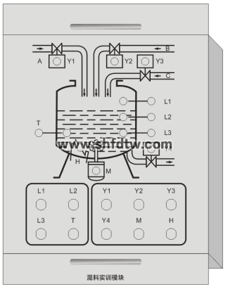 可進行PLC編程控制模擬兩種物料混合配料運行過程。模塊使用各種顏色的LED指示燈模擬兩種物料的加料過程、輸送過程、混合配料過程。PLC信號通過接線端子方式連接到模塊上。提供設(shè)備架構(gòu)三維圖。