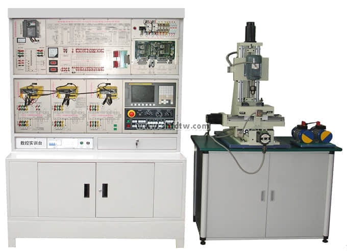 TWF-MB型數(shù)控銑床電器和維修實驗臺由數(shù)控控制臺和實訓(xùn)銑床部件(三坐標(biāo))組成實訓(xùn)考核教學(xué)設(shè)備。系統(tǒng)采用法那科0I Mate MD銑床數(shù)控系統(tǒng),數(shù)控銑床的X、Y、Z軸由伺服電機控制,主軸由變頻器控制,X、Y、Z軸拖板采用滾珠絲桿進行傳動,學(xué)生可以學(xué)習(xí)到0I Mate MD伺服電機的控制、變頻器控制、霍爾元件、接近開關(guān)的原理和PLC指令、編程、接線及在數(shù)控機床中的應(yīng)用等及數(shù)控銑床編程、加工、維修。