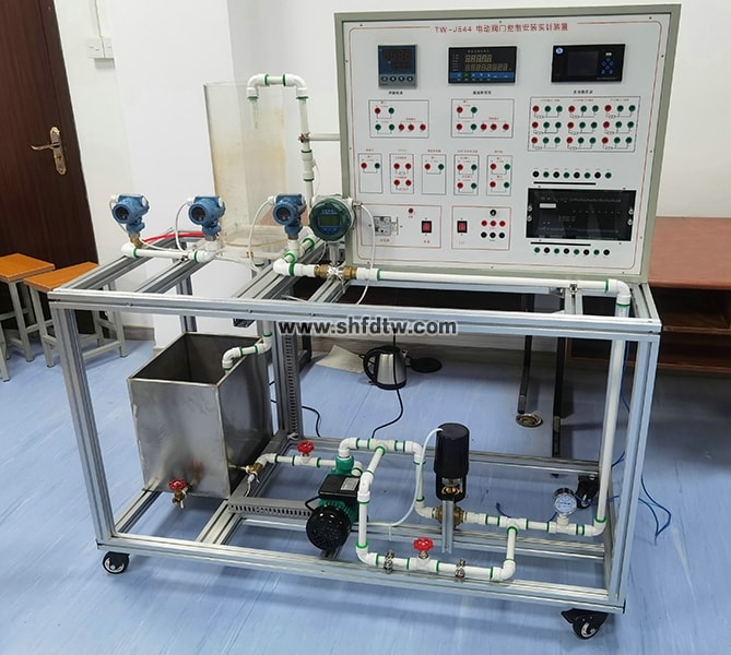 電動閥門控制安裝實訓(xùn)裝置由水泵、壓力調(diào)解閥、電磁閥、水位傳感器、位式調(diào)節(jié)控制儀、無紙記錄儀、上下水箱等組成。