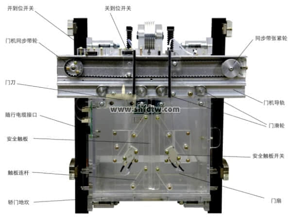 在轎廂門的邊沿上,裝有活動(dòng)的安全觸板。當(dāng)門在關(guān)閉過(guò)程中,安全觸板與乘客或障礙物相接觸時(shí),通過(guò)與安全觸板相連的聯(lián)桿,觸及裝在轎廂門上的微動(dòng)開關(guān)動(dòng)作,使門重新打開,避免事故發(fā)生。