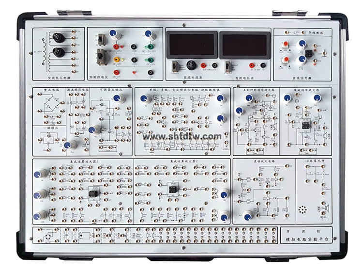 實(shí)驗(yàn)箱由鋁木合金箱體、高性能線性電源、和實(shí)驗(yàn)電路板組成。其中實(shí)驗(yàn)電路采用固定功能模塊方式,電路原理和元器件符號(hào)清晰,實(shí)驗(yàn)用元器件可以焊裝在線路板的反面,安全可靠,不易損壞,也可以裝在線路板的正面,元件直觀可見,感性認(rèn)識(shí)強(qiáng),正面還有實(shí)驗(yàn)電路原理圖,使學(xué)生在實(shí)驗(yàn)時(shí)對(duì)原理一目了然。
