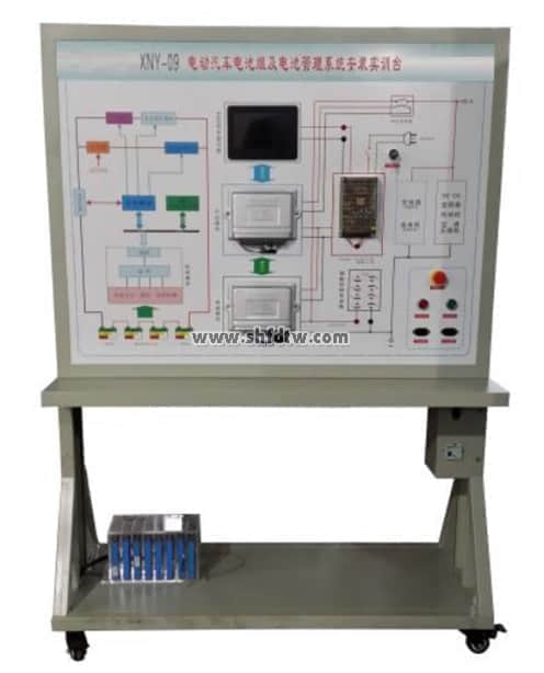 3、實驗臺面板上安裝有電源總開關(guān)、BMS電池管理控制單元、7寸BMS信息顯示屏、急停開關(guān)、點動開關(guān)、12V開關(guān)電源、充放電插座、電源檢測端子等,可直接在面板上檢測電源控制單元電信號,如電阻、電壓、電流、頻率信號等。
