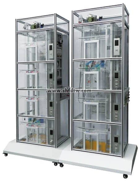 1、由兩臺四層透明仿真教學客梯組成,由層外兩處按鈕共同控制。