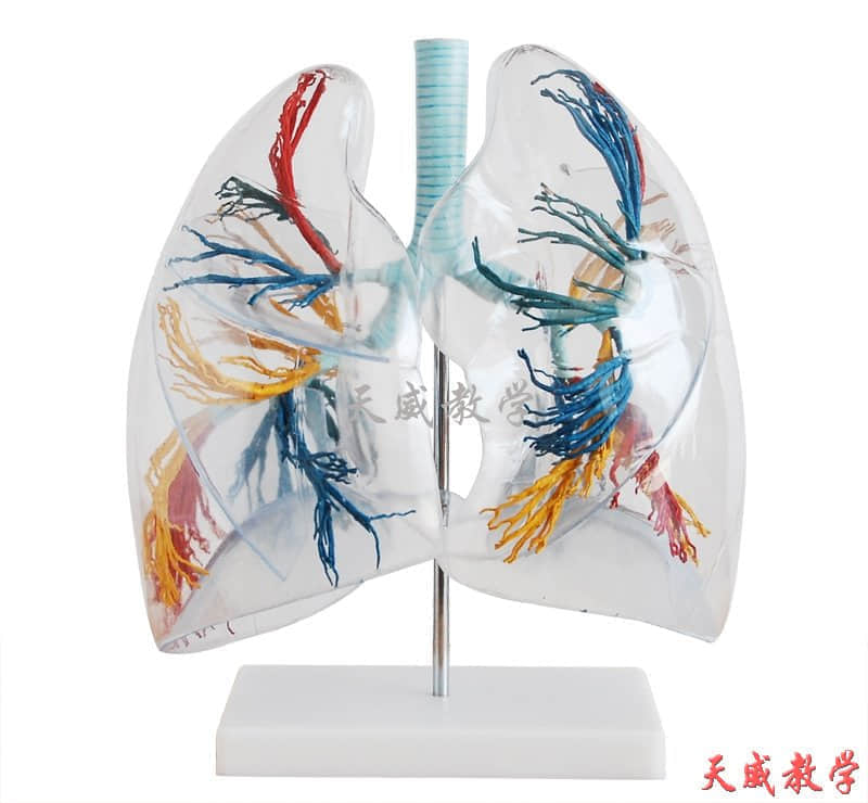 本模型供醫(yī)學(xué)院校講解人體解剖學(xué)、胸外科和內(nèi)科等課程時(shí)作直觀教具用。顯示左右兩肺的分段,左肺八個(gè)段,右肺十個(gè)段,從透明肺殼可以觀察支氣管樹(shù)的分布情況。本模型肺外形用透明塑料制,氣管和支氣管樹(shù)用塑料制。2倍放大。