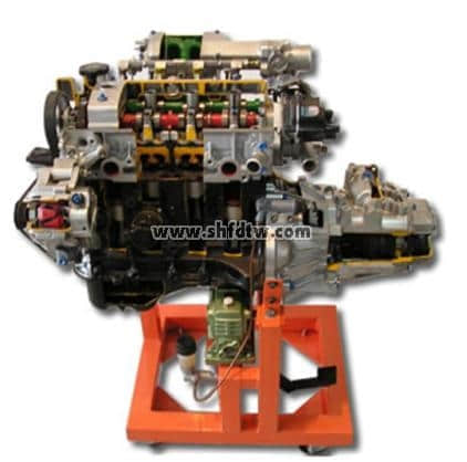 二、功能特點 1.采用發(fā)動機(jī)與變速器實物總成進(jìn)行機(jī)構(gòu)切剖,充分展示發(fā)動機(jī)機(jī)與變速器構(gòu)部分的內(nèi)外結(jié)構(gòu)。 2.對發(fā)動機(jī)與變速器各機(jī)械剖面采用不同顏色的油漆進(jìn)行噴涂。 3.由可調(diào)轉(zhuǎn)速的單相齒輪減速電機(jī)帶動發(fā)動機(jī)曲軸做低速運轉(zhuǎn),真實演示內(nèi)部機(jī)械部件的運動過程。 4.移動臺架采用了高強(qiáng)度的鋼結(jié)構(gòu)焊接,表面經(jīng)噴涂工藝處理。移動臺架底部帶有自鎖腳輪裝置,可移動式,方便教學(xué)。 5.解剖部位: 缸體(活塞與曲軸運行外可觀察); 氣門室蓋(凸輪軸運行外可觀察); 氣缸蓋(進(jìn)排氣門運行外可觀察); 進(jìn)排氣歧管與濾清器; 發(fā)電機(jī)與水泵; 正時機(jī)構(gòu)(正時機(jī)構(gòu)運行外可觀察); 變速器(同步器等,外可觀察)