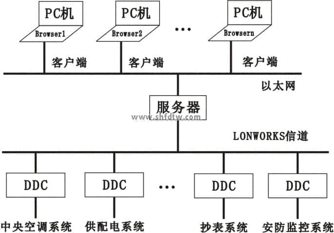 網(wǎng)絡(luò)化是智能樓控系統(tǒng)的一個重要發(fā)展方向,而基于LonWorks總線的樓控網(wǎng)絡(luò)系統(tǒng)是目前智能建筑發(fā)展的一種主流,2006年LonTalk協(xié)議成為中國國家標(biāo)準(zhǔn)化指導(dǎo)性技術(shù)文件GB/Z 20177.1-2006?!疤旎徒虄x”為更好地滿足智能樓宇教學(xué)的需要,與美國埃施朗和國內(nèi)相關(guān)廠家進行合作,推出了一系列基于LON總線的智能樓宇教學(xué)實驗裝置。“TWLYZX-1現(xiàn)場總線樓宇綜合控制系統(tǒng)”是此類系列產(chǎn)品之一。它具備IBMS系統(tǒng)兩級網(wǎng)絡(luò)和三層管理(控制)的典型結(jié)構(gòu),即采用現(xiàn)場總線網(wǎng)(Lonwalks信道)和由B/S結(jié)構(gòu)構(gòu)成的局域網(wǎng)兩級網(wǎng)絡(luò)結(jié)構(gòu),現(xiàn)場(DDC)控制、過程管理(服務(wù)器)、遠程客戶管理三層管理結(jié)構(gòu)。其結(jié)構(gòu)如下圖所示:
