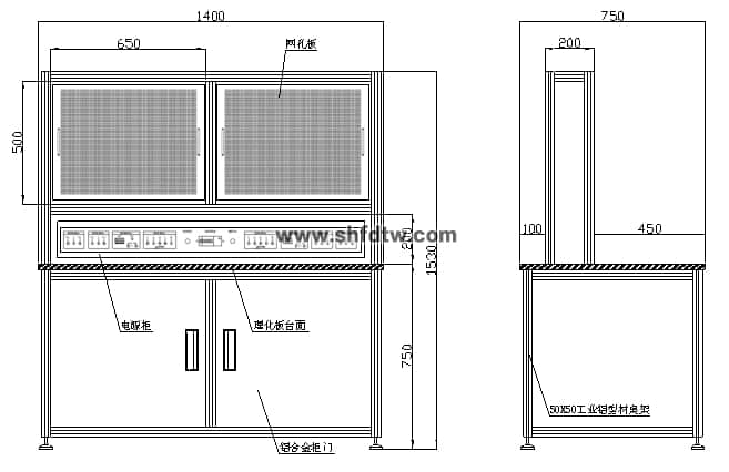 (5)桌架下部設(shè)計(jì)木質(zhì)工具柜,二開門設(shè)計(jì),用于放置工具、電氣元件及資料等。外形尺寸約:1300×600×530mm