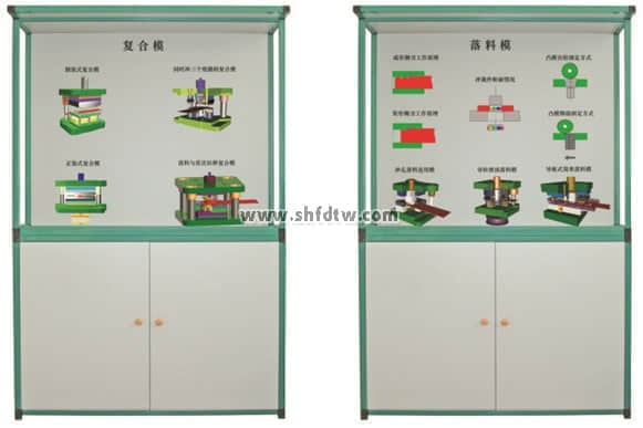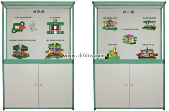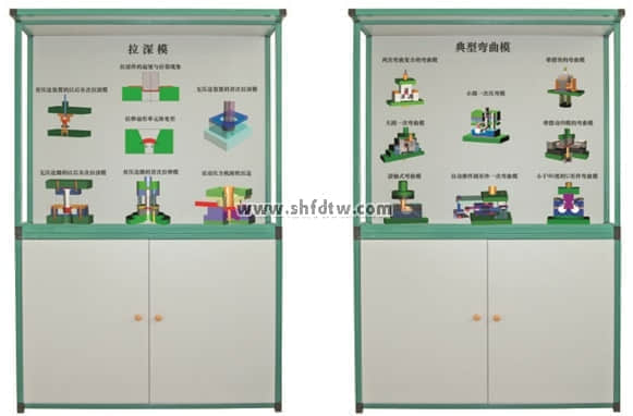 沖壓模具設(shè)計(jì)與制造陳列柜共分八個柜和一個電腦控制臺,進(jìn)行多媒體動畫同步演示。由PC電腦軟件控制順序或任選播放三維動畫同步模型演示沖壓模具功能原理。本套陳列柜47件沖壓模具均采用高強(qiáng)度硬聚氯材料制作而成,各種模具均可進(jìn)行拆分裝配。
