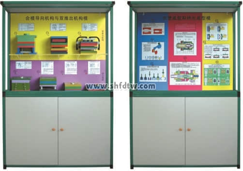 陳列柜共分十二個(gè)柜和一個(gè)電腦控制臺(tái),進(jìn)行多媒體動(dòng)畫演示。由PC電腦軟件控制順序或任選播放三維動(dòng)畫同步模型演示模具功能原理。本套陳列柜80多件塑料模具均采用高強(qiáng)度硬聚氯材料制作而成,各種模具均可進(jìn)行拆分裝配。