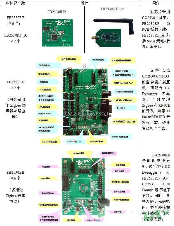 TW-FIT1000標(biāo)配共用8個Zigbee節(jié)點,每個節(jié)點均由一個射頻板與一個底板構(gòu)成,如下表: