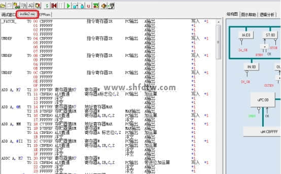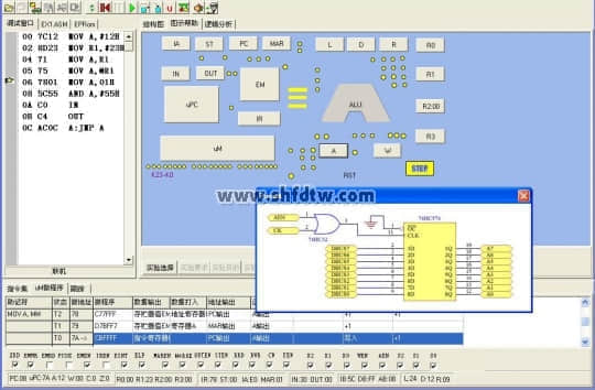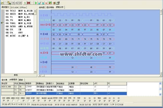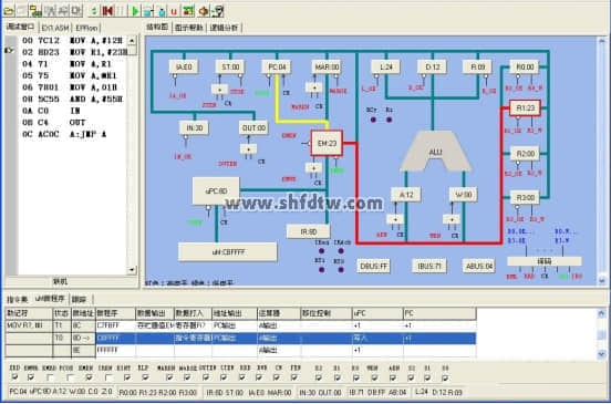(5) 運算器、存儲器、控制器等計算機各部件的實時動態(tài)圖形調(diào)試界面,豐富的調(diào)試手段,具有單步、微單步、運行、暫停等功能,圖形畫面以不同顏色實時顯示不同數(shù)據(jù)流向,簡潔明了,生動形象。