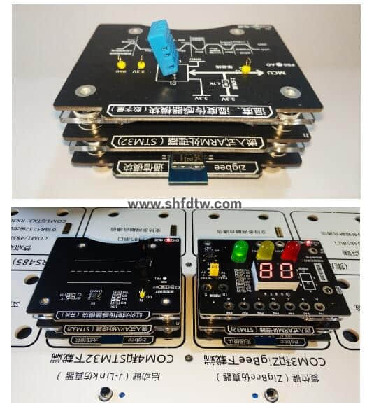 模塊均采用磁吸式接口設計+搭積木式結構,集成標準的12路彈性插針,可以實現(xiàn)供電、仿真調(diào)試、數(shù)據(jù)通信、IO口拓展等功能,同時支持搭積木式的多級磁吸聯(lián)接,通過彈性插針即可通信,無須外接跳線,通過模塊相互搭積木,組成一套完整的物聯(lián)網(wǎng)系統(tǒng),如:STM32處理器+ZigBee無線模塊+傳感器模塊(3層垂直積木,無須額外接線),可拓展性強,如下圖所示: