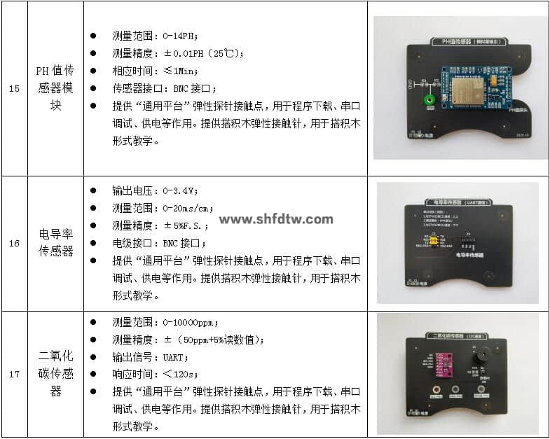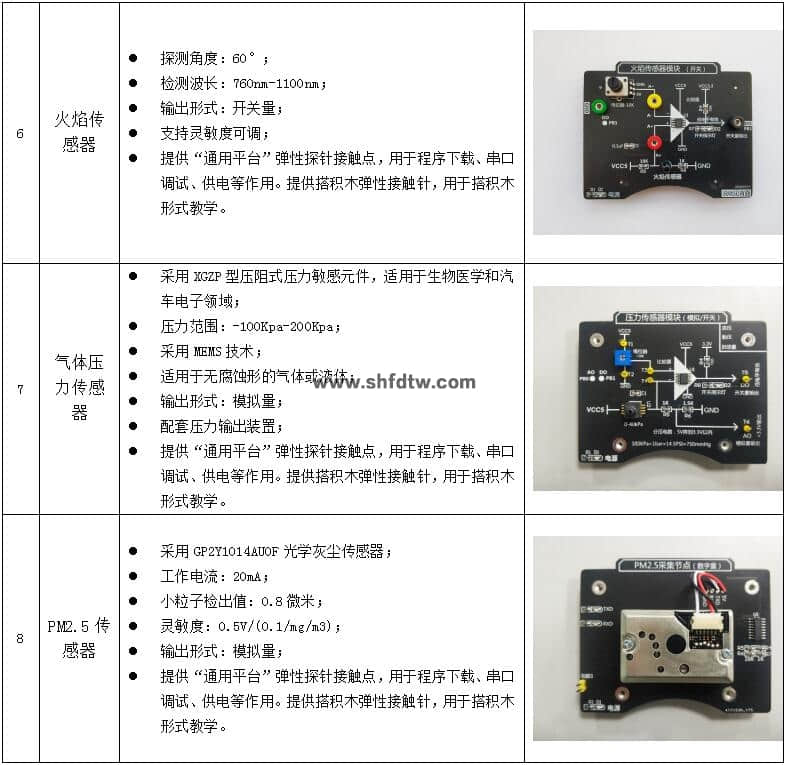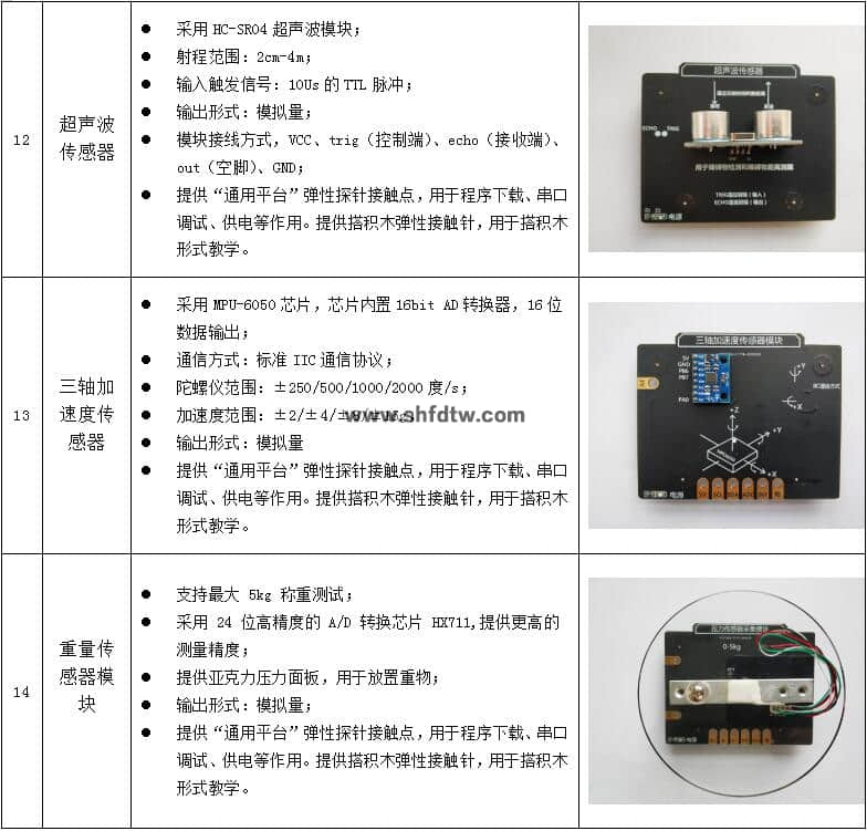 (選配)傳感器模塊:火焰、氣體壓力、PM2.5、土壤濕度、距離感應、超聲波、加速度、PH值、電導率、二氧化碳、紅外測溫傳感器及其配套資料;
