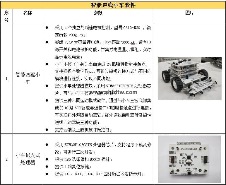 智能小車套件可選:智能四驅(qū)小車、嵌入式處理器、三種傳感器(紅外避障、紅外巡線、電磁巡線)人工智能攝像采集模塊、紅綠燈模擬器模塊、遠程遙控模塊等;
