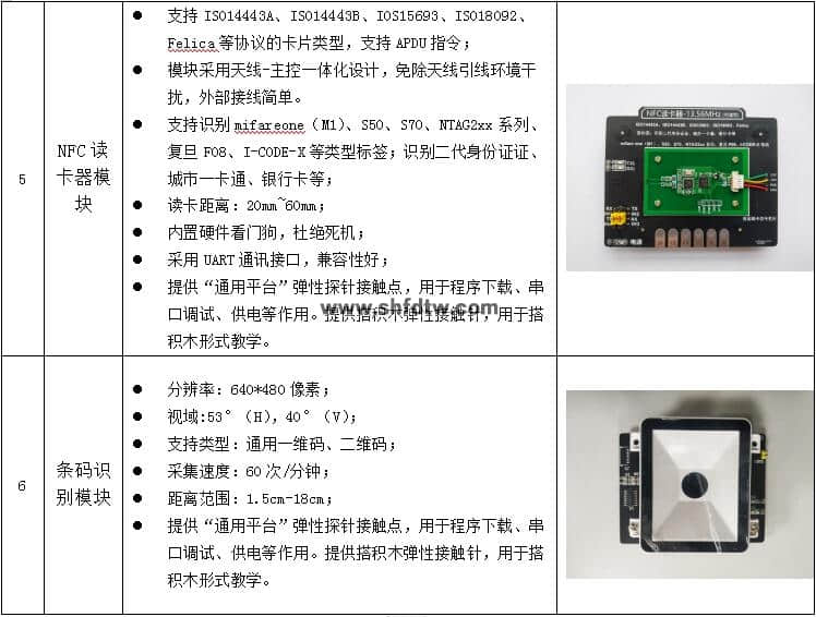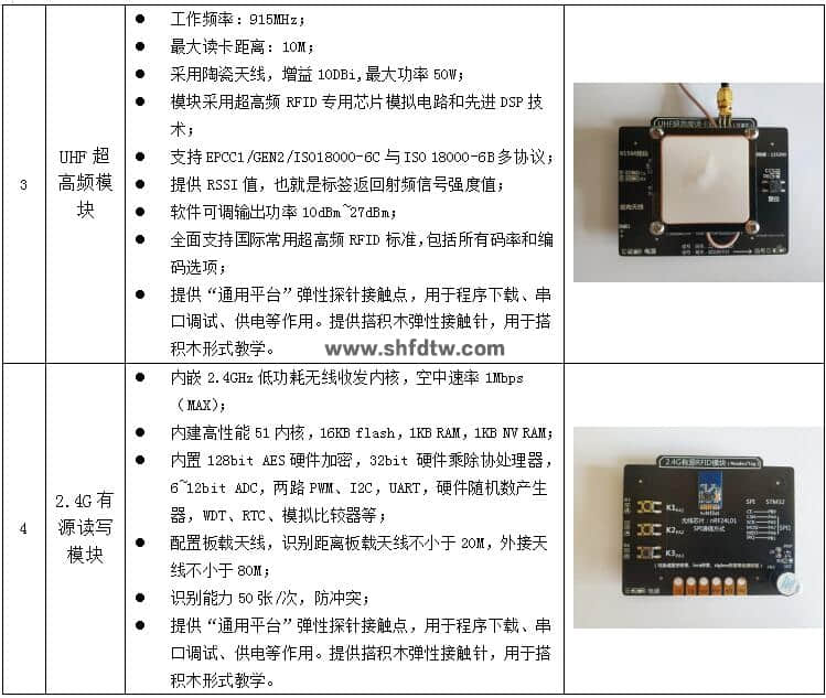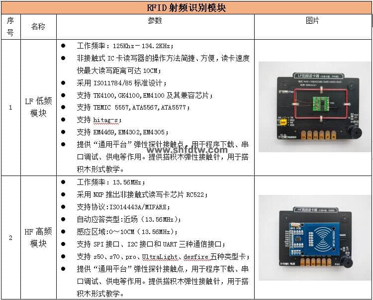 (選配)RFID 射頻識別模組:125K(LF低頻讀卡器*1)、13.56M(HF 高頻讀卡器*1)、900M(UHF 超高頻讀卡器*1)、2.4G(有源RFID*2)、NFC 讀卡器(1個)、條碼采集節(jié)點(1個),提供源碼、DEMO 例程、智能門禁等演示軟件;