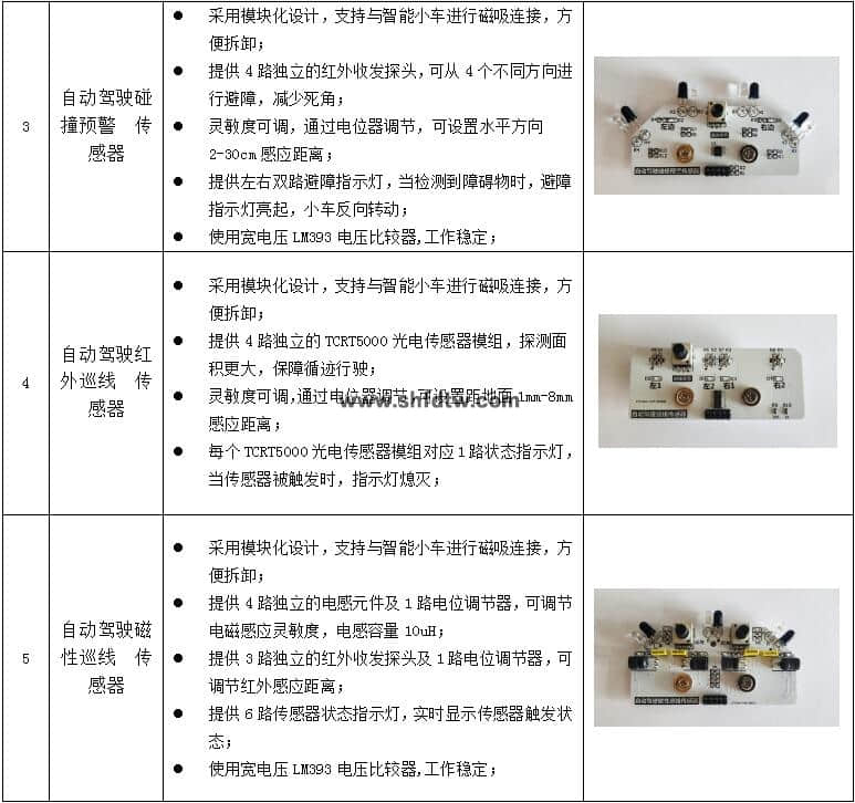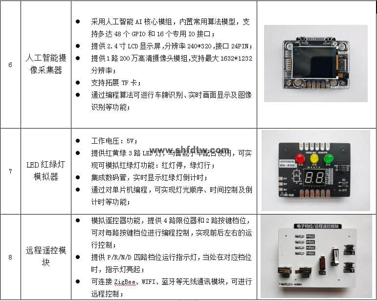 (選配)智能小車模組:智能四驅(qū)小車(1臺)、嵌入式處理器模塊(1個)、自動駕駛碰撞預警傳感器(1個)、自動駕駛紅外巡線傳感器(1個)、自動駕駛磁性巡線傳感器(1個)、人工智能攝像采集模塊(1個)、紅綠燈模擬器模塊(1個)、遠程遙控模塊(1個);