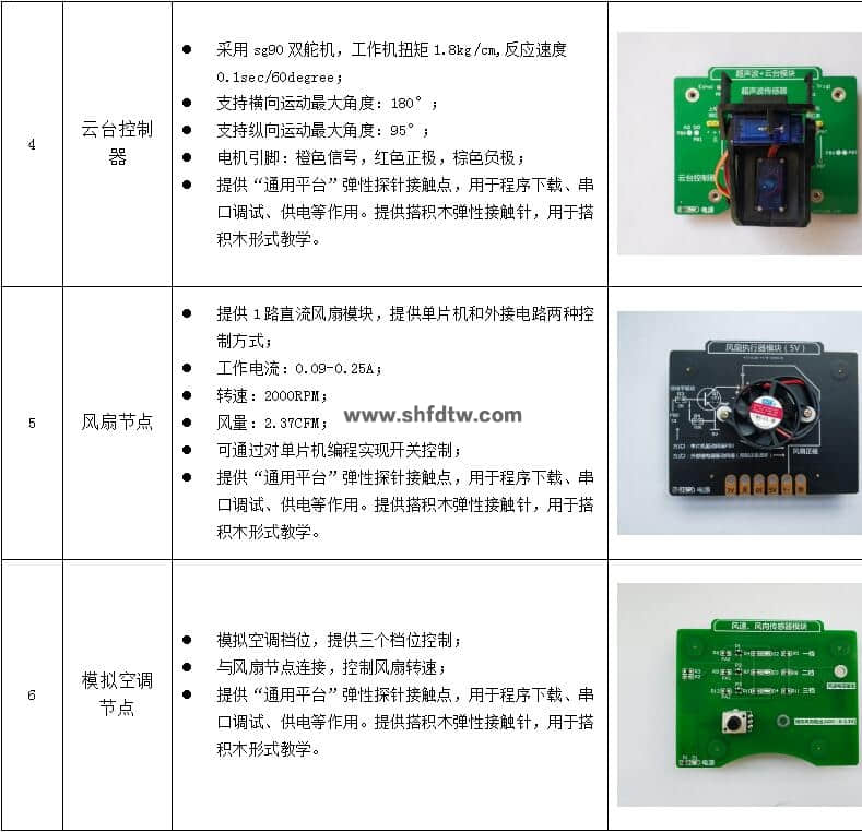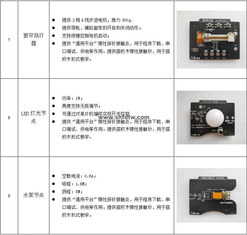 (選配)執(zhí)行器模塊:步進電機、云臺控制、模擬空調(diào)節(jié)點、窗簾執(zhí)行器、LED燈光節(jié)點、水泵節(jié)點、噴霧器節(jié)點及其配套資料;