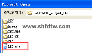 在彈出的窗口中,找到工程文件并雙擊進(jìn)入,找到以.pjt為后綴的文件,雙擊該文件就可以添加進(jìn)CCS,如下圖6-2所示: