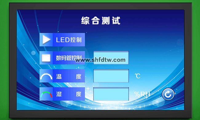 ① 首先進(jìn)行的綜合程序?qū)嶒?yàn),加載LED例程,點(diǎn)擊LED顯示進(jìn)入綜合測(cè)試畫(huà)面,內(nèi)設(shè)三個(gè)模塊測(cè)試,在CCS上點(diǎn)擊運(yùn)行程序,然后分別點(diǎn)擊觸摸屏的LED控制、溫度、濕度按鈕就可以觀察到實(shí)用板的LED變化以及溫濕度顯示,然后點(diǎn)擊數(shù)碼管顯示旁邊的空白框,會(huì)彈出系統(tǒng)鍵盤(pán),然后輸入數(shù)字,點(diǎn)擊ENTER,就可以觀察到實(shí)用板轉(zhuǎn)接板上的數(shù)碼管變化(注意:一次只能輸入一個(gè)數(shù)字,連續(xù)輸入時(shí)先刪除掉原先輸入的數(shù)字,再重新輸入);